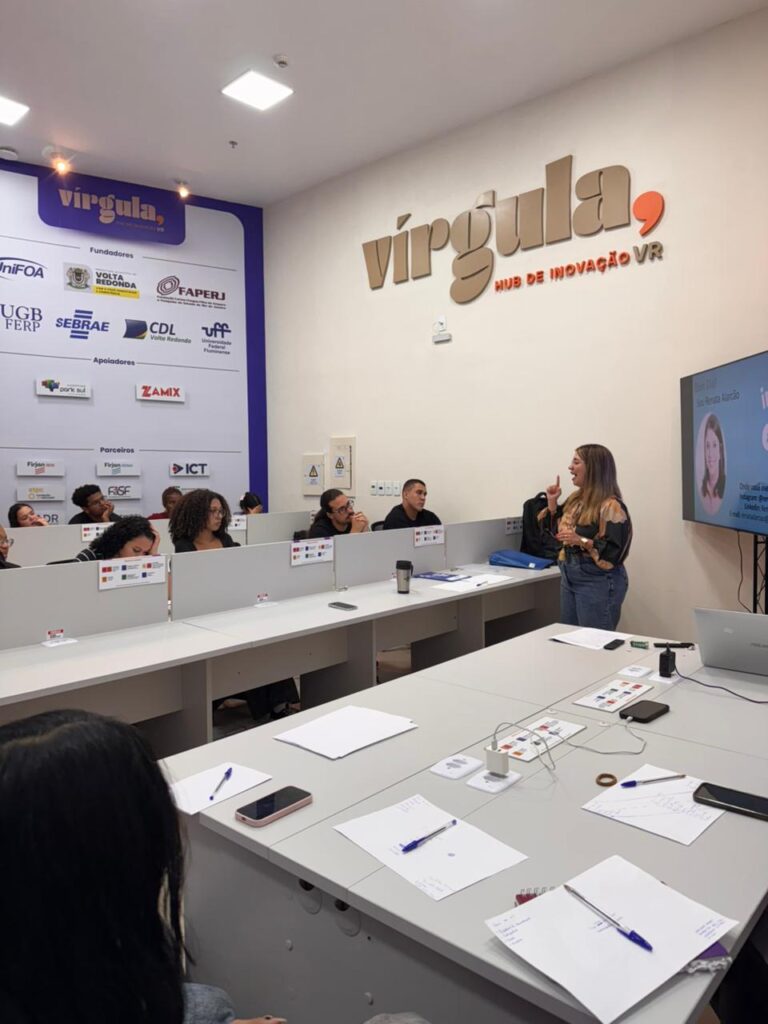 A programação teve início com uma apresentação conduzida pela gestora do Vírgula Hub, que apresentou o ecossistema, o papel do hub no fortalecimento da inovação regional e conceitos fundamentais sobre o funcionamento de startups, novas tecnologias e modelos de negócios inovadores.